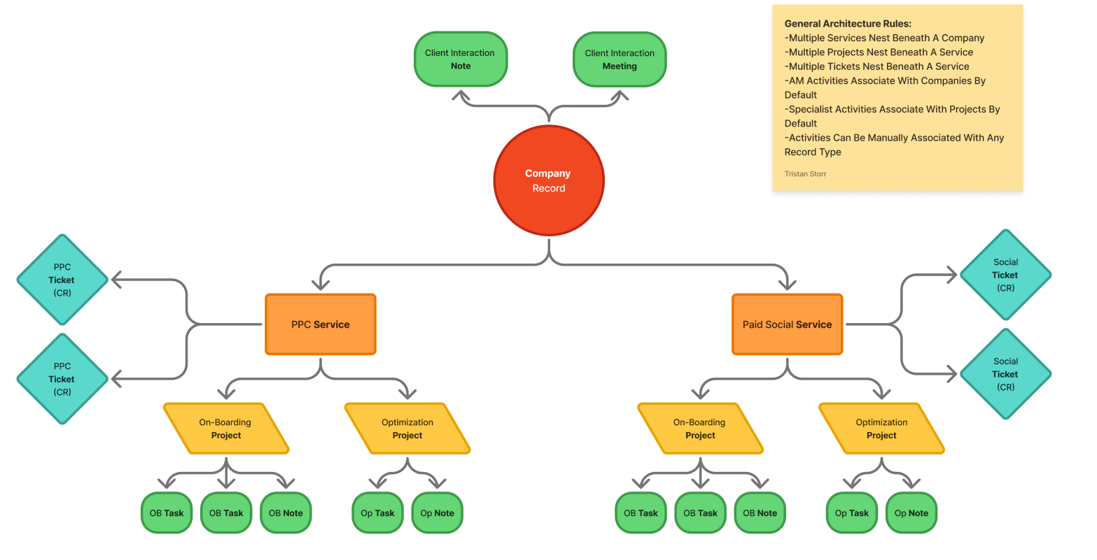 Service: Represents a specific service line the client uses (PPC, Paid Social, etc.). Services nest beneath Companies and contain all Projects and Tickets for that service type. Services act as a central record in HubSpot architecture from which other objects can be accessed.